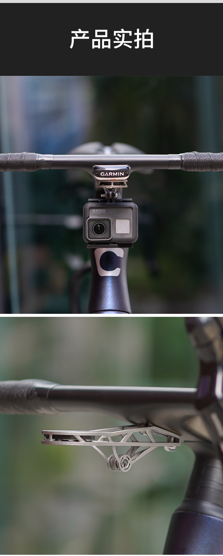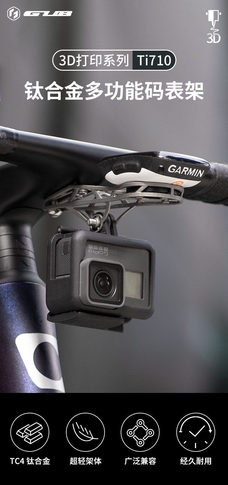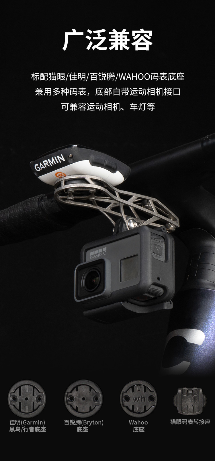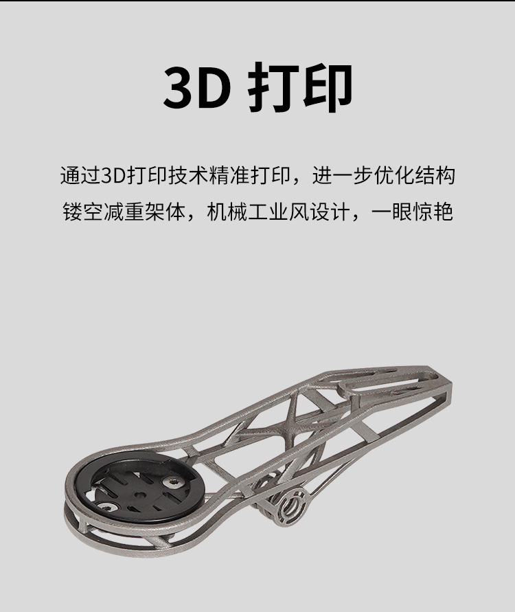 特點:鈦合金超輕架體,3D打印工藝,居中安裝節(jié)省空間(一體把專用),兼容多種碼表,標(biāo)配運動相機(jī)轉(zhuǎn)接座,可擴(kuò)展使用運動相機(jī)等配件