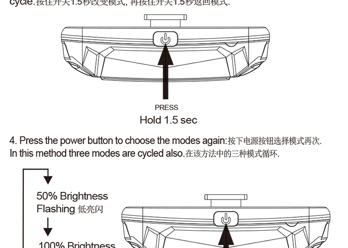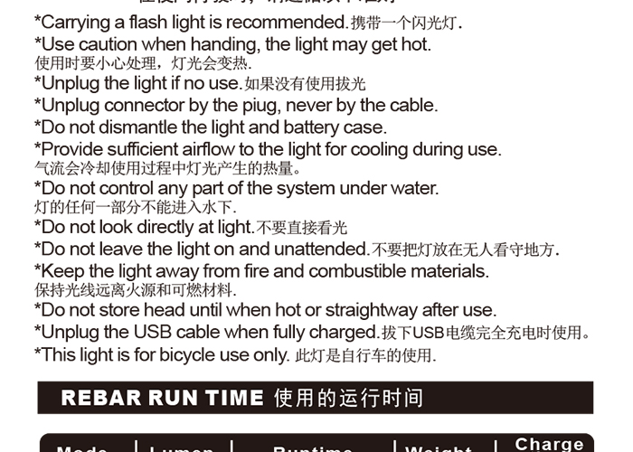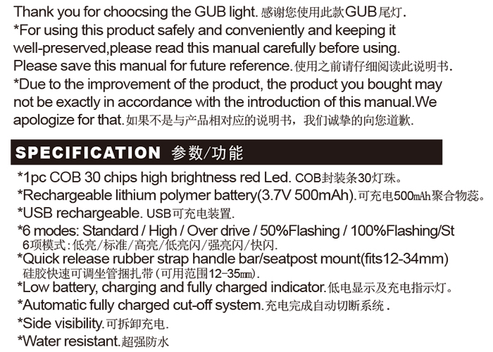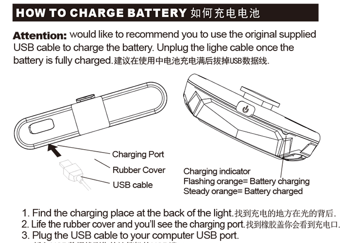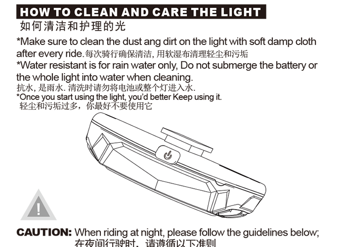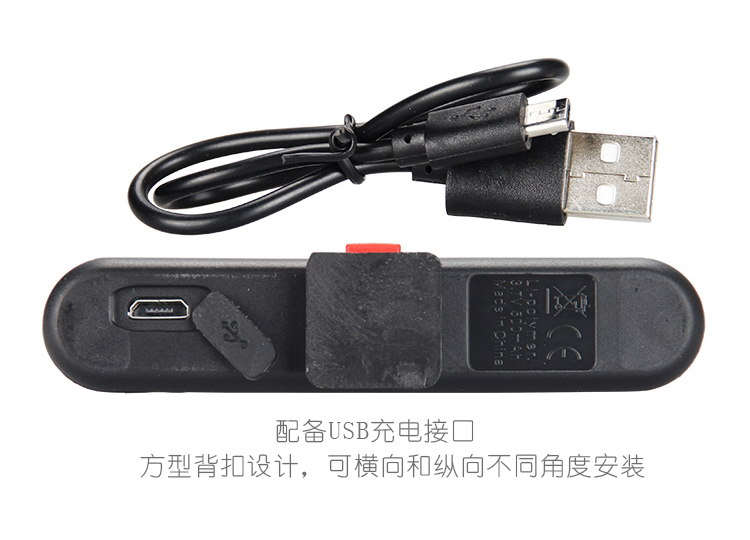 特性:LED技術(shù),COB整面發(fā)光30顆燈珠,高亮100流明設(shè)計(jì);配備USB接口,可循環(huán)充電;六種模式可循環(huán)切換;電池自動保護(hù)功能,電壓低于2.8V不工作;硅膠捆扎固定方式,120度方位調(diào)整,方便拆卸安裝;方型背扣設(shè)計(jì),可橫向和縱向不同角度安裝;可安裝在坐管,下叉,車把手,前叉等。