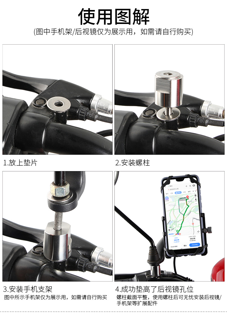 簡介:此配件為后視鏡輔助配件,采用不銹鋼材質(zhì),耐用不生銹,用于摩托車/電動(dòng)車后視鏡孔位的擴(kuò)展,起到墊高或更好適配的作用。