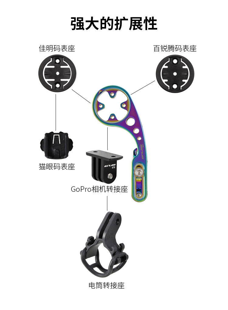安裝在車把上,可伸縮設(shè)計(jì),兼容佳明碼表,使用附帶的配件可兼容百銳騰碼表、貓眼碼表,另標(biāo)配運(yùn)動(dòng)相機(jī)轉(zhuǎn)接頭和電筒轉(zhuǎn)接頭。