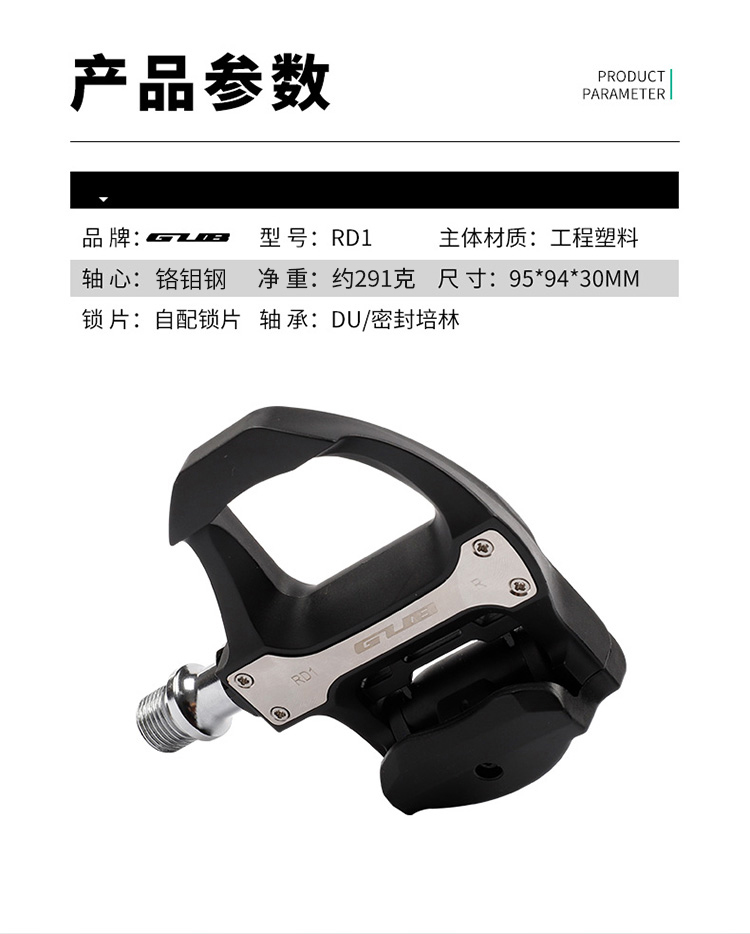 名稱:GUB RD1 公路車自鎖鎖踏 適用類型:公路車 材質(zhì):工程塑料+鉻鉬鋼軸心 重量:凈重約291克/對、毛重約462克 統(tǒng)一零售價:158元