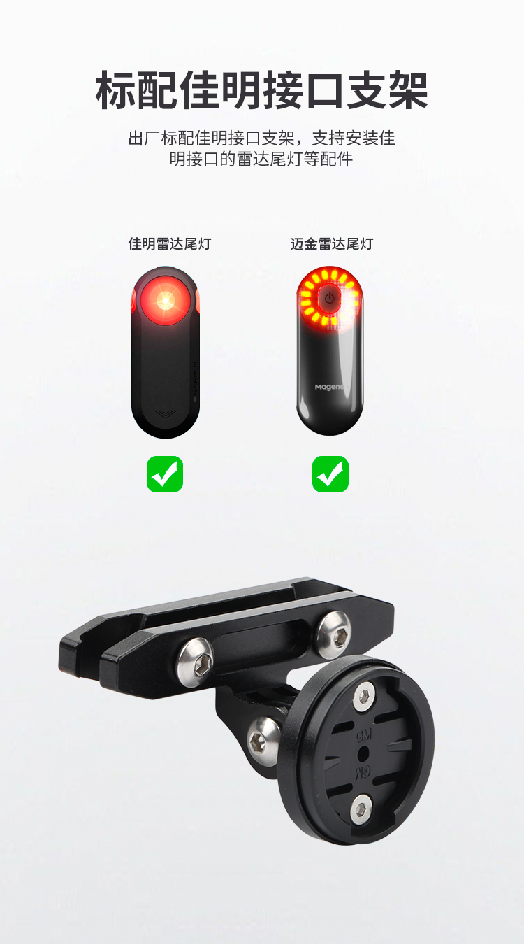 特點(diǎn):鋁合金材質(zhì)堅(jiān)固耐用,安裝在坐墊軌道后方,標(biāo)配佳明接口支架,適用于佳明接口的尾燈安裝,也可以直接安裝GOPRO運(yùn)動(dòng)相機(jī)等配件