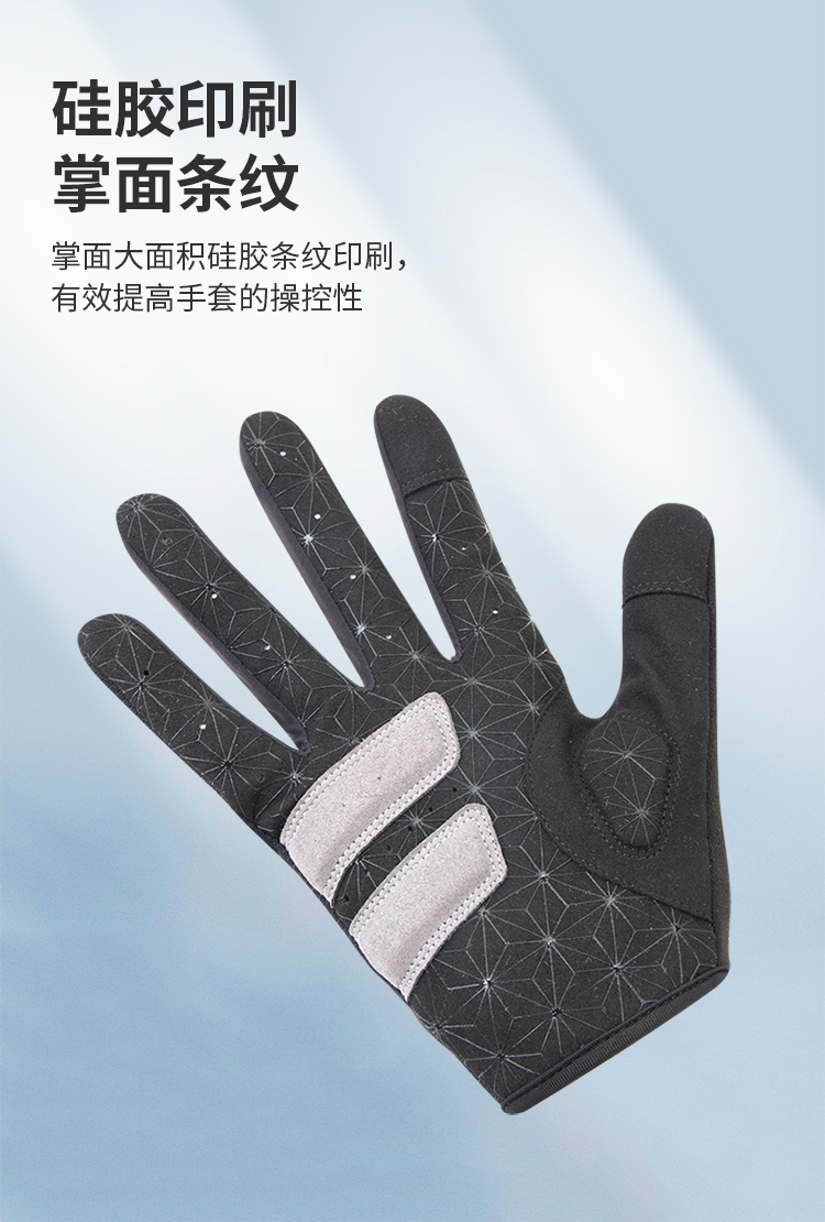 特點:簡約設(shè)計、貼合手掌,手背高彈透氣面料,手掌大面積硅膠印刷條紋,防滑效果好,支持觸屏