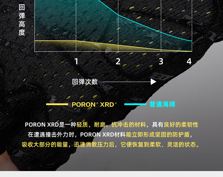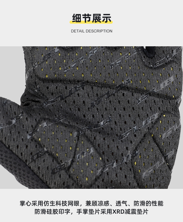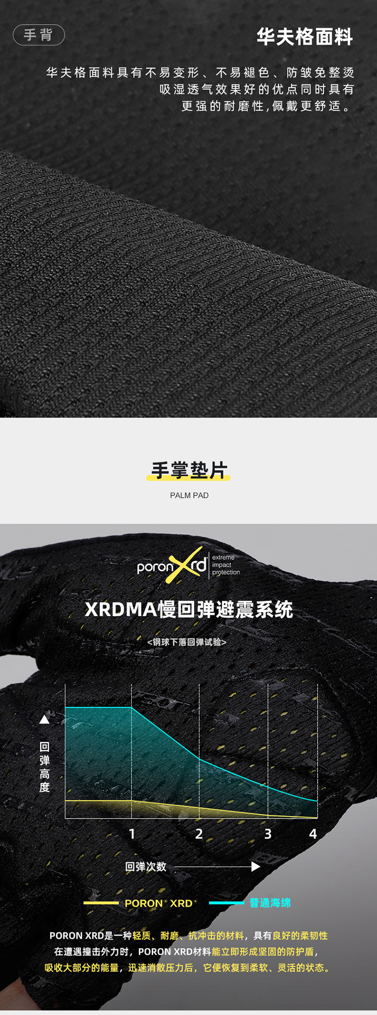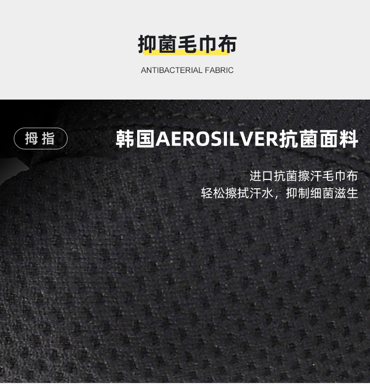 材質:華夫格高彈透氣面料、進口PORON XRD 緩沖掌墊、掌心采用仿生科技網(wǎng)眼、韓國Aerosilver抗菌面料(擦汗布)