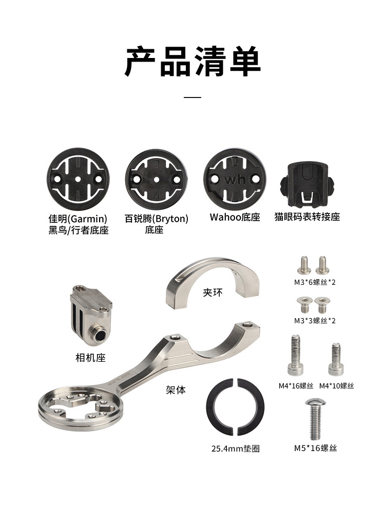 配置:配運(yùn)動(dòng)相機(jī)轉(zhuǎn)接座,wahoo、佳明、百銳騰和貓眼碼表接座、25.4mm墊圈一對(duì)