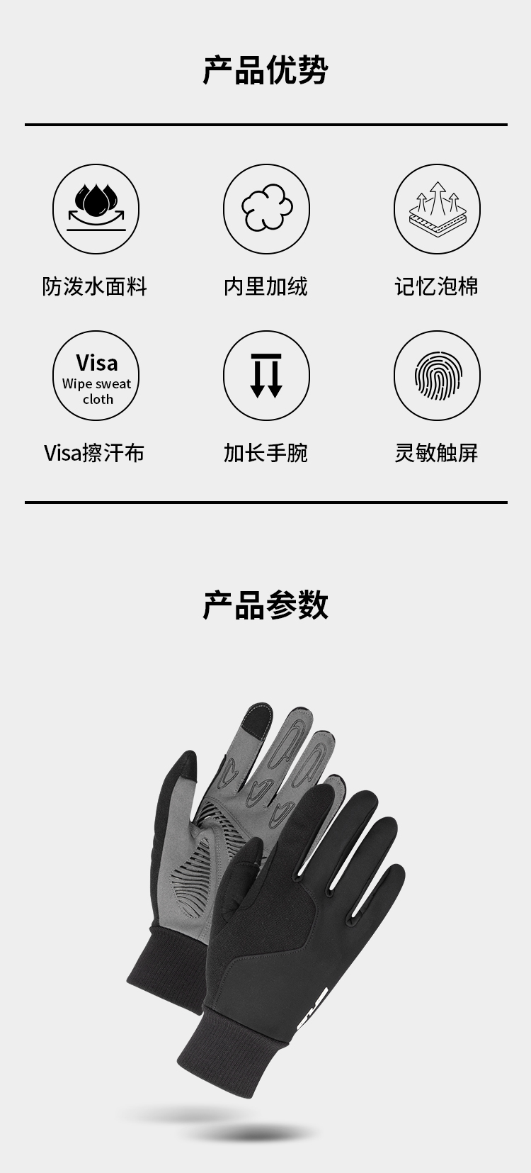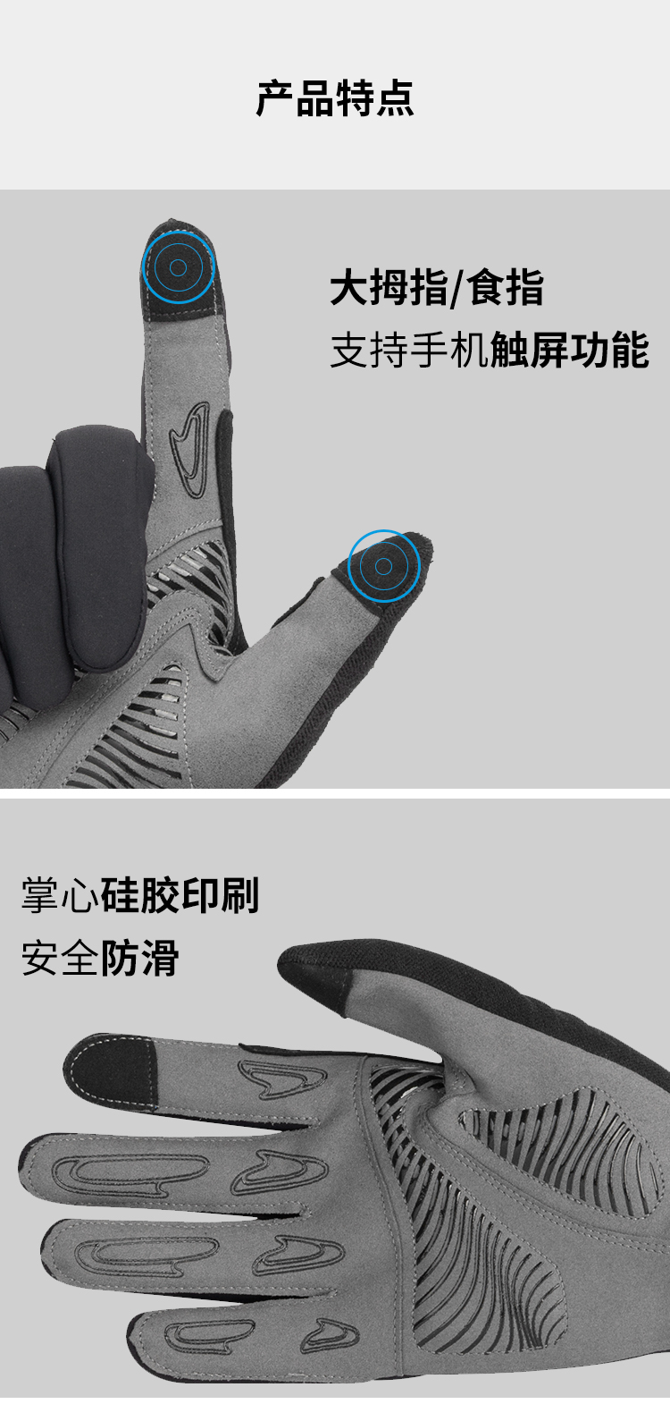 特點:內里加絨,抵御寒風,柔軟舒適,3D立體裁剪,防滑耐磨,支持觸屏