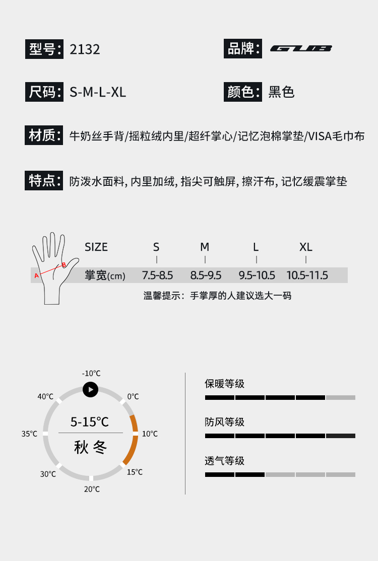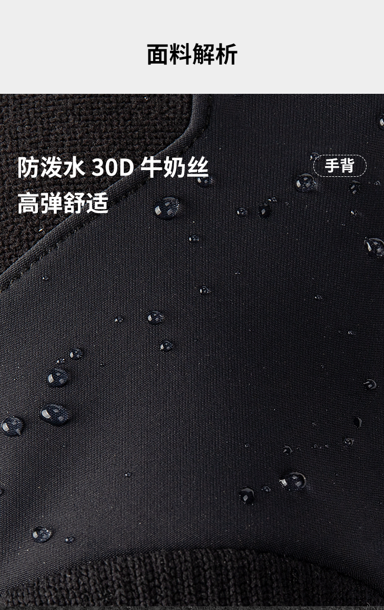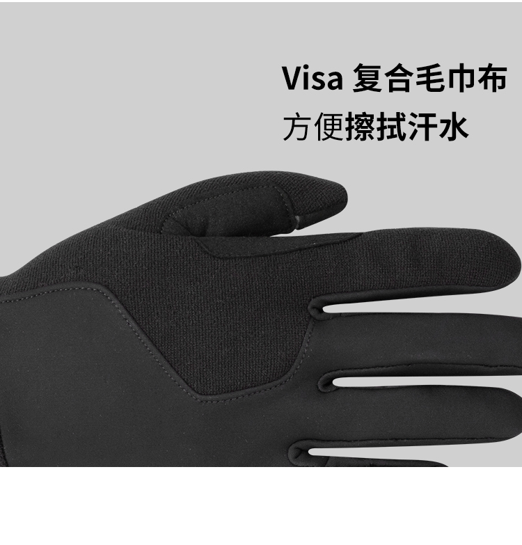 材質:30D牛奶絲手背、搖粒絨內里、超纖手掌、3MM記憶掌墊、Visa擦汗布、拇指食指導電布
