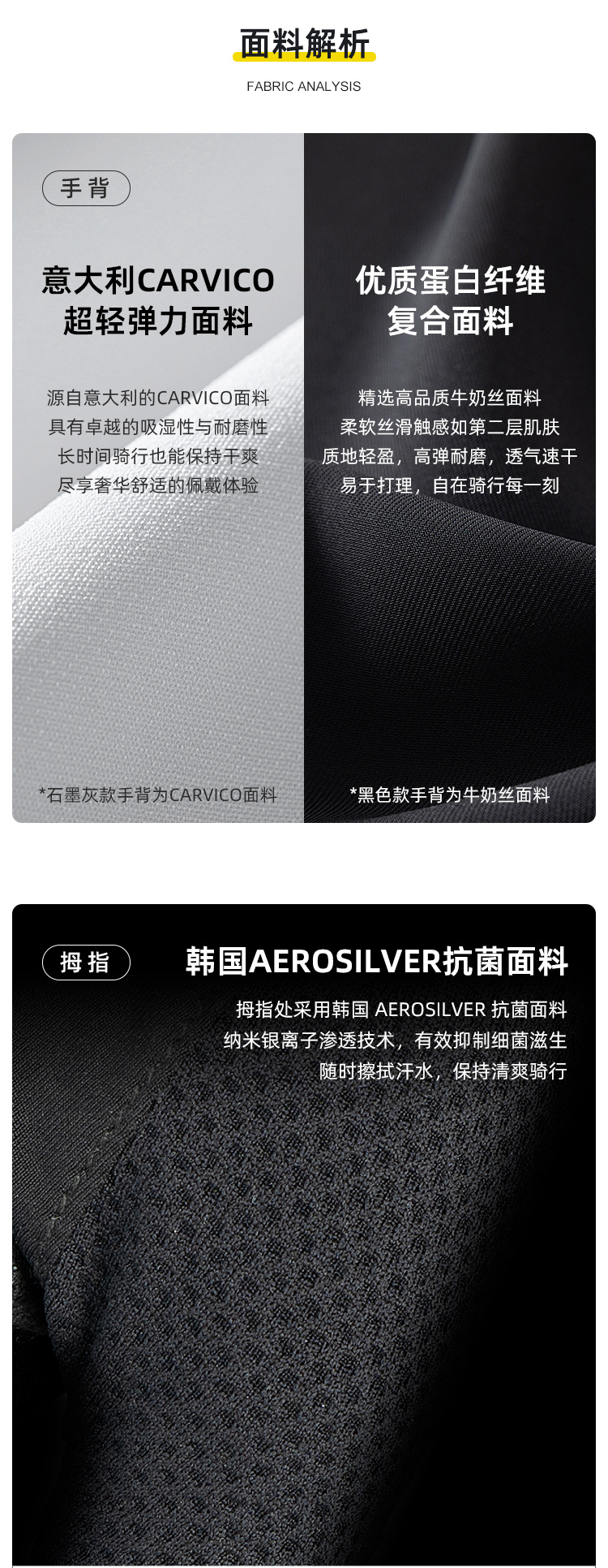 材質(zhì):意大利Carvico(石墨灰)、牛奶絲手背面料(黑色)、3D打印TPU掌墊、進(jìn)口PORON XRD緩沖掌墊、韓國大孔PU掌面、韓國Aerosilver抗菌面料(擦汗布)